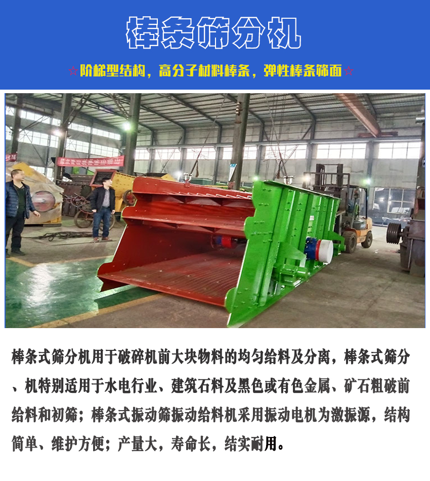 棒條式篩分機用于破碎機前大塊物料的均勻給料及分離,棒條式篩分機特別適用于水電行業、建筑石料及黑色或有色金屬、礦石粗破前給料和初篩;棒條式振動篩振動給料機采用振動電機為激振源,結構簡單、維護方便;產量大,壽命長,結實耐用。