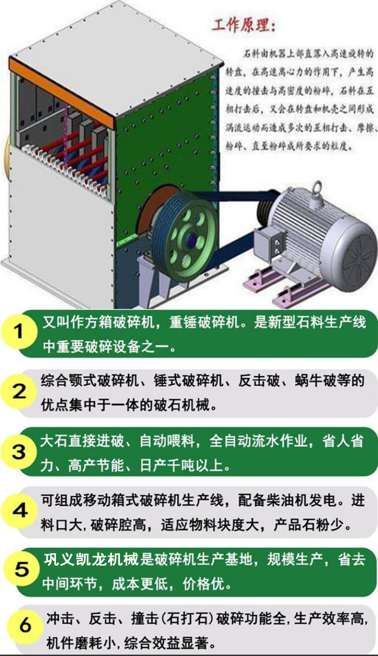 單錘式破碎機 (Box-type breaker)也稱重錘破碎機,方箱破碎機,是吸收國內外先進技術,綜合普通重錘式破碎機、反擊式破碎機、立軸重錘式破碎機及各種用錘頭(板錘)對石料進行打擊破碎的機械原理上,經過優化設計后,制造生產出了最新一代破碎機械產品,改變了以篦條控制出料顆粒大 小的方法,減少了錘頭在破碎腔內的磨損,使錘頭的壽命提高4—6倍,每付錘頭可破碎石料3—4萬噸,實現了破碎技術的重大突破,真正達到了事半功倍的效果。